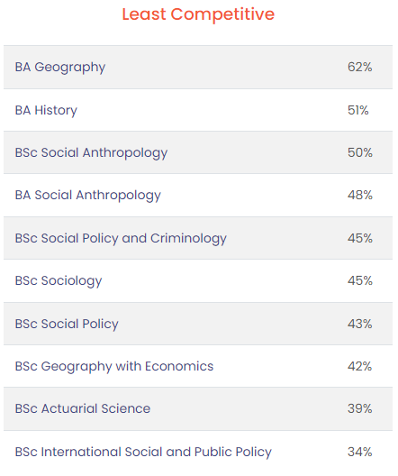 神学和宗教学 古典学 音乐 现代语言与语言学 现代语言 地质学 欧洲与中东语言 古典学与英语 化学本硕连读 哲学与现代语言 教学型硕士课程 教学型硕士竞争最小、录取率最高的专业有: 循证卫生保健 健康研究(硕士文凭课程) 儿科传染病(硕士文凭课程) 史学 睡眠医学(硕士文凭课程) 纳米技术的医学与卫生健康应用 实验和转化疗法 高等教育中的教与学 英国地方史 现代语言 研究型硕士/博士课程 研究型硕士竞争最小、录取率最高的专业有: 古典考古学 中世纪和现代语言学 古典语言文学 无机化学 物理和理论化学 妇女和生殖健康 历史 历史 历史(科学史、医学史、经济史和社会史) 临床神经科学 剑桥大学 本科课程 剑桥大学本科课程竞争最小、录取率最高的专业有: 古典学 盎格鲁-撒克逊,北欧和凯尔特 考古学 音乐 亚洲与中东研究 现代与中世纪语言 神学,宗教与宗教哲学 地理 语言学 教学型硕士专业 教学型硕士竞争最小、录取率最高的专业有: 实践研究(医) 咨询服务(医) 人类进化史研究 临床科学 亚述学 欧洲文学和文化 生物科学 犯罪学研究 中世纪与复兴文学 中世纪史 研究型硕士/博士专业 研究型硕士竞争最小、录取率最高的专业有: 生理学、发育与神经科学 现代和中世纪语言:意大利语 生物科学 现代和中世纪语言:法语 化学工程 医学 医学科学 动物学 精神病学 历史学 伦敦大学学院(UCL) 本科课程 伦敦大学学院本科课程竞争最小、录取率最高的专业有: 法语与德语 欧洲语言教学化学 环境地质学 德语与俄语 意大利语与西班牙语 地质学 自然科学 古典学 化学 德语与历史 授课型硕士课程 教学型硕士竞争最小、录取率最高的专业有: 国家特殊教育需求协调奖 领导力 商务管理 教育学硕士证书(SCITT) 教育学硕士证书(School Direct) 识字学习与识字困难 教育神经科学 埃及和近东考古学硕士 恢复性牙科实践 临床眼科实践 研究型硕士/博士课程 研究型硕士竞争最小、录取率最高的专业有: 分子模拟与材料科学 土木,环境和测绘工程 教育与儿童心理学 生物科学 考古研究所 人类学 哲学 风险和减灾 斯拉夫与东欧研究 流行病学和卫生保健 历史学 伦敦政治经济学院 本科课程 伦敦政治经济学院本科课程竞争最小、录取率最高的专业有: 地理学 历史学 社会人类学(理) 社会人类学(文) 社会政策与犯罪学 社会学 社会政策 经济地理学 精算学 国际社会与公共政策 授课型硕士课程 教学型硕士竞争最小、录取率最高的专业有: 卫生经济、支出与管理(高级工商管理硕士) 卫生政策,规划和融资 城市管理(高级工商管理硕士) 工商管理硕士(全球高级工商管理硕士) 管理学(全球高级工商管理硕士) 卫生经济、政策与管理(高级工商管理硕士) 社会商业和创业(高级工商管理硕士) 公共管理(高级工商管理硕士) 全球语境下的欧洲文化与冲突 全球卫生政策 研究型硕士/博士课程 研究型硕士竞争最小、录取率最高的专业有: 经济地理学 国际历史 人文地理与城市研究 数学 人类学 统计学 经济史 哲学 社会研究方法 社会心理学 帝国理工学院 本科课程 帝国理工学院本科课程竞争最小、录取率最高的专业有: 地质学与地理物理学 地理物理学 地质学 分子生物工程 化学与分子物理 化学 地质学 材料科学与工程 生物工程(法语) 化学与药物化学 授课型硕士课程 教学型硕士竞争最小、录取率最高的专业有: 数字化健康管理 功能组学 生态学与进化学的计算方法论 健康政策 工商管理硕士 应用基因组学 生态学,进化学与转化学 可再生与进化生物学 分类学,生物多样性与进化 安全与恢复:科学与技术 研究型硕士/博士课程 研究型硕士竞争最小、录取率最高的专业有: 热带森林生态 生态系统与环境变化 生态学、进化与保护研究 结构分子生物学 分子植物与微生物科学 系统生物学与合成生物学 医疗机器人与图像引导干预 生物医学研究 分子和细胞生物科学 临床研究